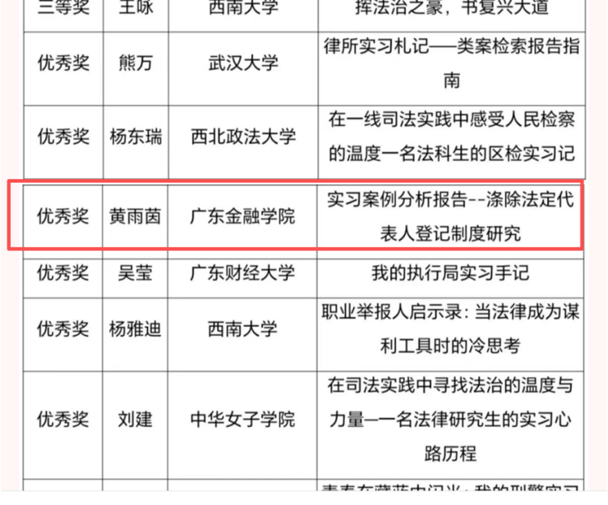 2025年9月26日,由西南大学法学院承办的第三届全国法学院(系)“坤博杯·我的实习故事”主题征文活动获奖名单公布。本次比赛共收到来自全国60余所高校的同学投稿200余篇,经过专业教师和实务专家对所有来搞进行两轮匿名评选,广东金融学院法学院22级知识产权专业黄雨茵同学和24级知识产权专业陈梓淳同学杀出重围,荣获优秀奖。