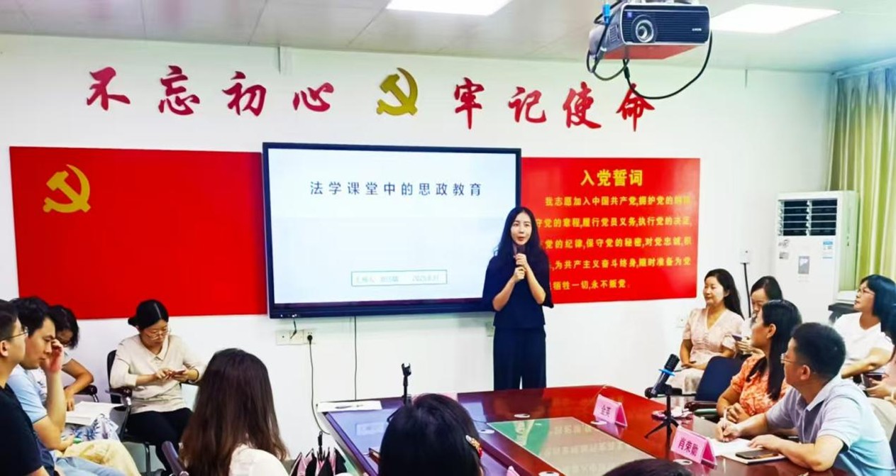 法学院优秀青年教师欧达婧博士围绕法学课堂中的思政教育,结合比赛经历,就思政内容如何更好地融入法学课堂内容进行了精彩分享。首先在专业知识的讲授过程中,欧达婧博士建议老师们可合理拓展课程知识点的广度、深度和温度,提炼法律条文所蕴含的思想价值,引导学生关注法条和知识点所体现的对当前时代、当前社会重要问题的回应,提升课程的引领性、时代性和开放性。其次,在法学课程讲授中,欧达婧博士指出可在分析法条、运用法条的过程中结合社会主义核心价值观,教育引导学生将社会主义核心价值观内化为精神追求、外化为自觉行动。欧达婧博士特别强调,在培养学生对法律条文与法学知识的运用能力时,作为老师需更多地结合现实的、热点的相关案例,引导学生深入社会实践、关注现实问题,培育学生经世济民、诚信服务、德法兼修的职业素养。欧达婧博士的精彩分享获得了老师们的一致好评,现场气氛十分热烈。