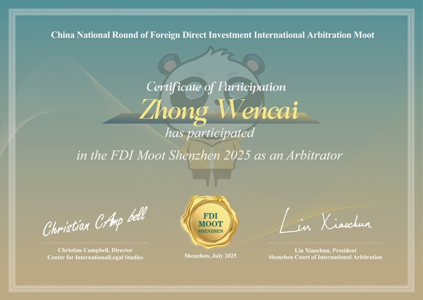 2025年7月27日,由深圳国际仲裁院(SCIA)主办的国际投资模拟仲裁大赛深圳杯2025(FDI Moot Shenzhen 2025)闭幕。本届赛事吸引了来自中国内地、香港、澳门共44支赛队参赛,参赛队伍数量和比赛场次均创历史新高。法学院国际经贸规则系副主任钟文财博士再度受邀在该竞赛中担任裁判工作。