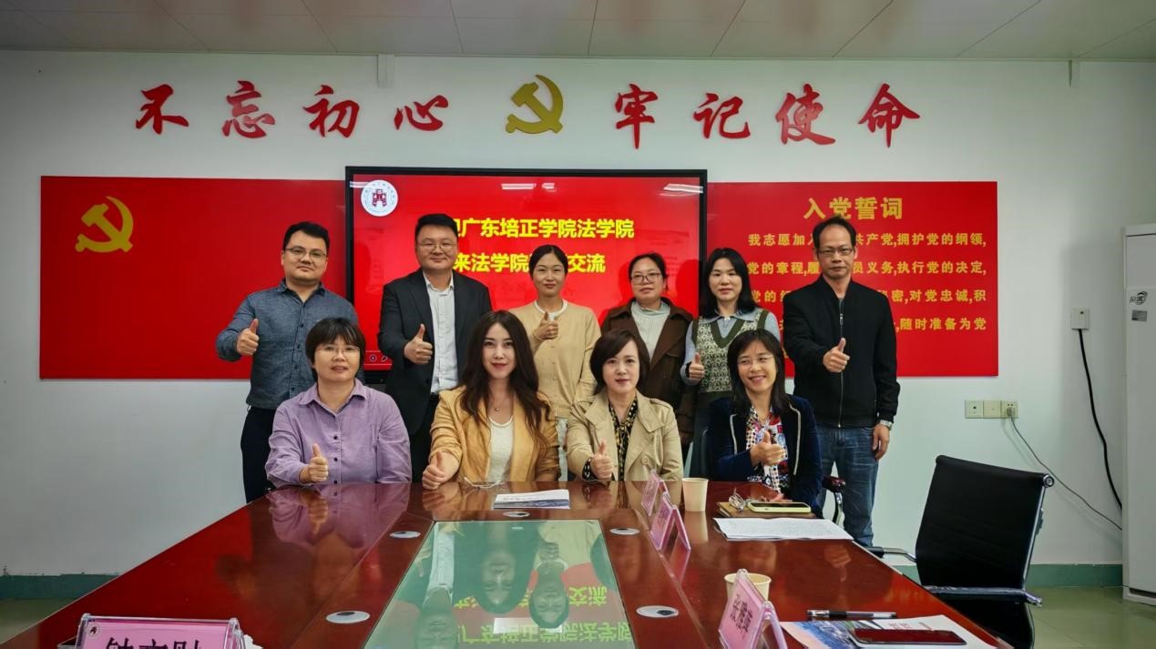 2025年10月22日,广东培正学院法学院院长吴文平率法学系系主任兰巧丽、行政管理系系主任沈俊美、教务办主任刘玉荣一行,赴我院就人才培养方案修订等工作开展调研交流。我院党委书记仝自力,院长张雅萍,党委副书记肖婉娴,副院长朱玛,法律学位教育中心主任陈衍桥,国际经贸规则系副主任钟文才,我校公共管理学院行政管理系系主任罗光华等出席交流活动。