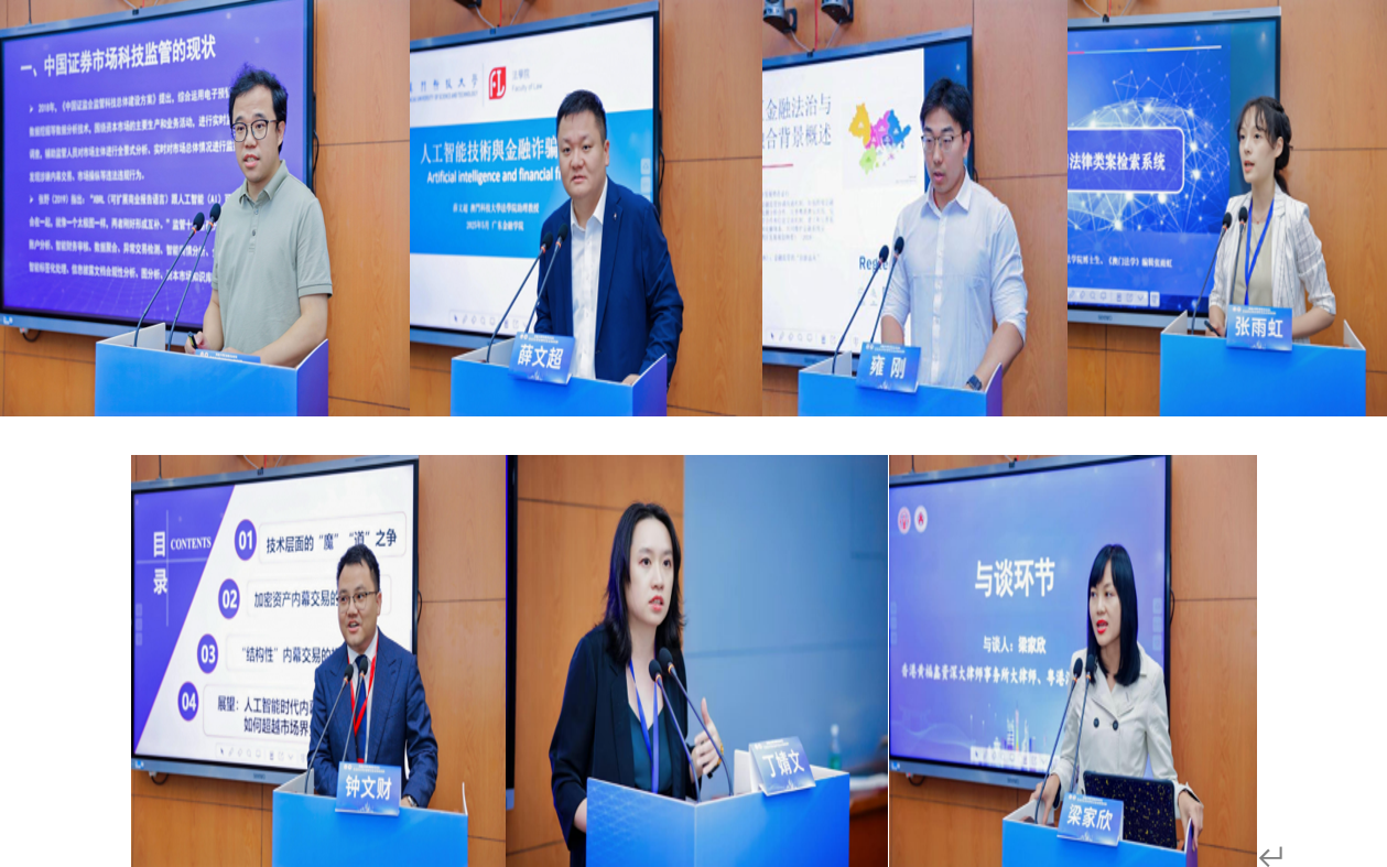 分论坛四围绕“人工智能与金融法治”展开,与会专家从各个方面进行了深入探讨:深圳大学法学院吕成龙副教授以《AI对证券市场监管的重塑和制度完善》为题进行阐述并提出相关措施;澳门科技大学法学院助理教授、博士生导师薛文超以《人工智能与金融诈骗防控》为题,指出AI技术在金融诈骗中的应用及反制方向;香港城市大学法学院博士生雍刚以《大湾区金融法治中监管科技的切入与开展》为题,指出三地法律、货币、监管框架差异,给跨境金融互联互通带来挑战;澳门大学法学院博士生张雨虹以《澳门法律类案检索系统》为题,展示了澳门大学研发的AI法律检索系统;广东金融学院法学院国际经贸规则系副主任钟文财博士以《人工智能时代金融市场内幕交易规制的挑战与回应》为题,指出AI技术在提升交易监测能力的同时,也催生了加密资产内幕交易和“结构性内幕交易”等新型违法形态;与谈人广东金融学院法律学位教育中心副主任丁婧文在总结嘉宾发言基础上指出粤港澳大湾区金融监管面临的挑战。香港黄福鑫资深大律师事务所大律师、粤港澳大湾区执业律师梁家欣对香港人工智能与金融法治发表了独到见解。