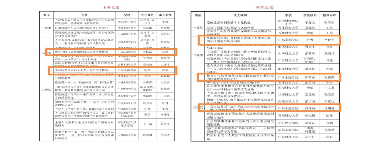 本届法律职业技能大赛竞争激烈,成果丰硕。据主办方统计,大赛共收到来自全国29所高校的1042篇参赛论文(本科生497篇,研究生545篇)。经过严格初审和由各高校法学院负责人组成的专家组交叉匿名复审,最终评选出本科生组和研究生组一等奖各3篇、二等奖各5篇、三等奖各10篇,共计36篇优秀论文获奖。广东金融学院法学院学子在此次高水平竞赛中表现突出,共有5篇学术论文脱颖而出,荣获奖项。具体为:由郝晶副教授指导的罗伟滨获本科生组二等奖,程莹副教授指导的陈希获本科生组三等奖;由李仲平教授指导的卢粤、张雅萍教授指导的陈茜芷、涂缦缦副教授指导的白梓涵分别获得研究生组二等奖和三等奖。我院获奖总数与承办方浙江财经大学法学院并列第一,充分彰显了我院在应用型、复合型法治人才培养方面的卓越成效。