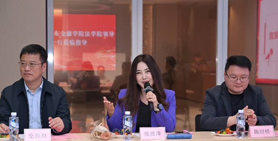 随后,法学院院长张雅萍教授作交流发言。她从三个层面系统阐述了此次调研交流的背景与期许:一是表达诚挚感谢。 她感谢广东法制盛邦(东莞)律师事务所为本次交流会提供的周到安排,感谢东莞校友会、法学院校友会及广大校友长期以来对母校发展的关心支持,正是校友们的卓越表现为法学院赢得了良好的社会声誉。二是全面介绍法学院发展概况。 张院长详细介绍了法学院近年来在学科建设、师资队伍、人才培养、科学研究以及社会服务等方面取得的新进展、新突破,重点阐述了“法学+金融”特色人才培养模式的改革成效,以及法律硕士专业学位授权点的建设情况。她指出,法学院始终坚持立足行业、服务区域,致力于培养具有扎实法学功底、深厚金融素养的高素质应用型法治人才。三是提出殷切期许。 她希望以此次交流为契机,进一步密切学院与校友及法律实务界的联系,在实习实训基地建设、实务导师聘任、科研项目合作、学生就业创业指导等方面建立长效合作机制,共同探索校地协同育人新模式。