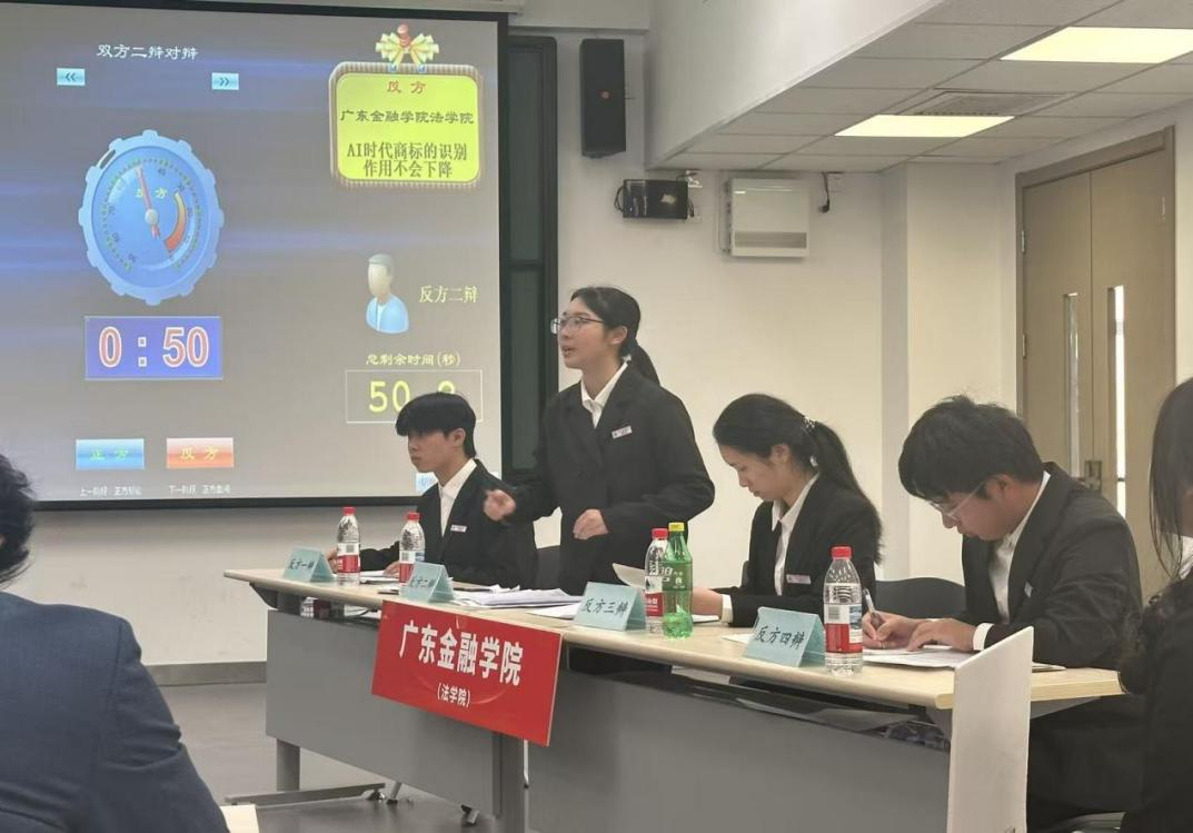 广东金融学院法学院代表队由法学院副院长朱玛、知识产权系副主任刘畅、法律学位教育中心副主任丁婧文担任指导老师,上场队员包括黄芷茵、蔡启睿、陈冉希、李泽宏四位同学。于3月28日上午与南华大学代表队,围绕辩题“AI时代,商标的识别作用会不会下降”展开辩论。经过激烈交锋,我院代表队展现出扎实的专业素养与清晰的逻辑思辨,赢得了本场比赛胜利,其中陈冉希同学凭借出色表现,荣获本场“最佳辩手”称号。