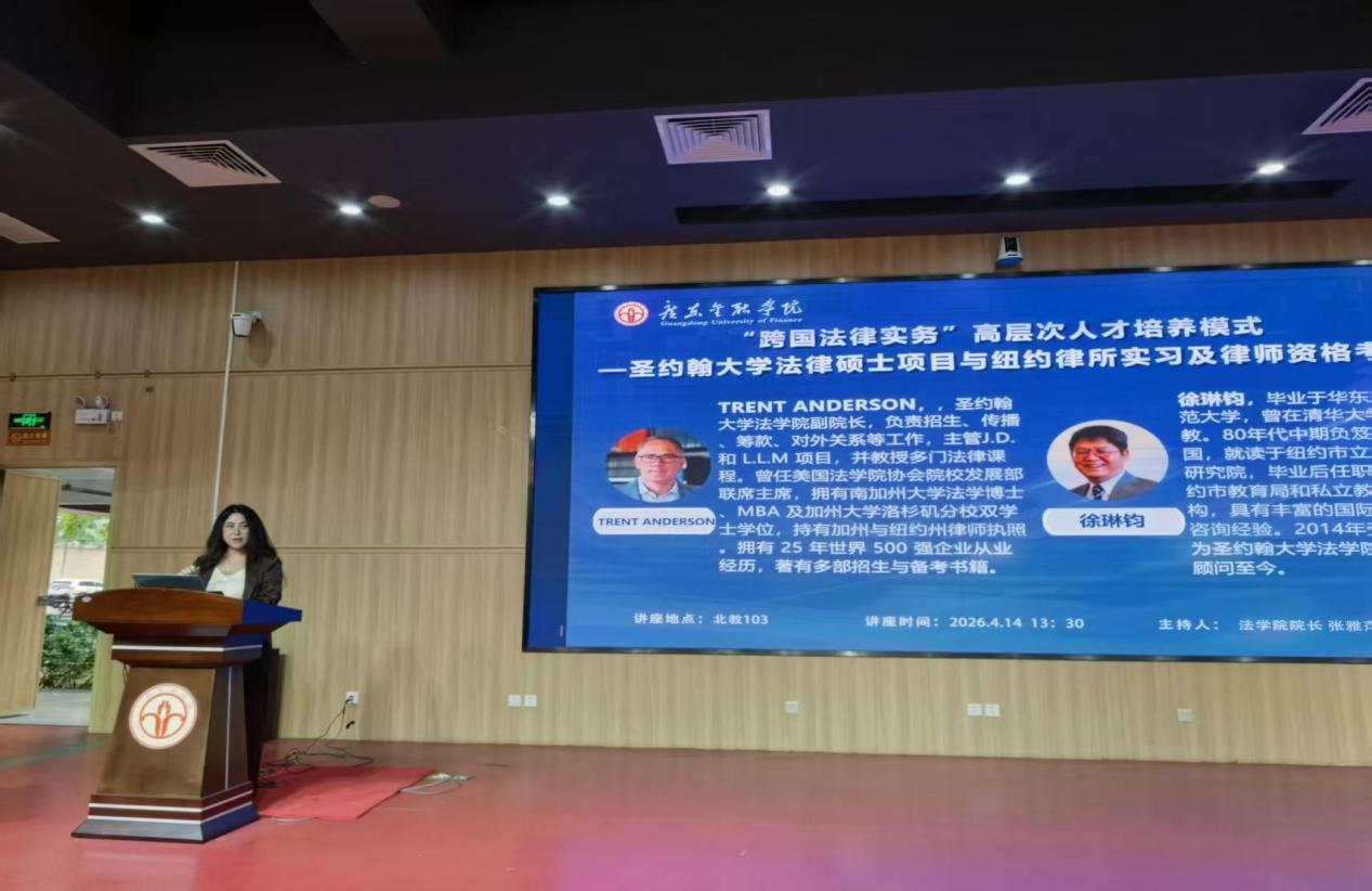 TRENT ANDERSON副院长围绕“跨国法律实务高层次人才培养”主题发表了精彩演讲,他指出,在经济全球化与数字贸易蓬勃发展的今天,跨国法律实务能力已成为法律人才的核心竞争力。圣约翰大学法学院高度重视与中国高校的合作,愿与广东金融学院法学院一道,为学生搭建通往国际法律舞台的桥梁,助力中国法治声音更广泛地参与全球治理。